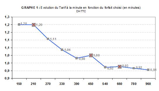 Le Graphe 1 montre que le prix à la minute est le même pour un forfait 2h30 ou 3h30. Pire encore, on constate que le tarif facturé par IAM à la minute est plus élevé pour un forfait 7h30 (450Mn) que pour un forfait 6h30 (390Mn) ou encore que le forfait 11h (660Mn) est plus coûteux à la minute que le forfait 9h (540Mn).